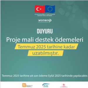 Women-Up 2 mali destek ödemeleri Temmuz 2025 tarihine kadar uzatılmıştır. Temmuz 2025 tarihine ait son ödeme Eylül 2025 tarihinde yapılacaktır. KADINSA İŞVEREN DESTEK BİZDEN